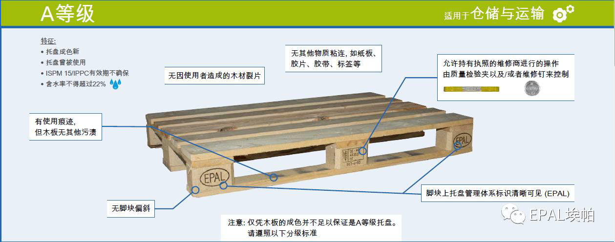 為了對EPAL二手托盤流通市場進(jìn)行的管理、幫助EPAL埃帕二手托盤使用企業(yè)進(jìn)行合理采購,EPAl埃帕現(xiàn)發(fā)布二手托盤分級(jí)交易指南。此流通指南參考了包括EPAL埃帕托盤生產(chǎn)商、維修商、運(yùn)輸公司、零售商等多方物流從業(yè)人員的意見,針對二手托盤的整體情況、成色、維修次數(shù)等等進(jìn)行了明確的分級(jí),將二手EPAL埃帕托盤按照整體情況分成了A、B、C三個(gè)等級(jí),幫助不同行業(yè)的客戶選購適合等級(jí)的二手托盤。