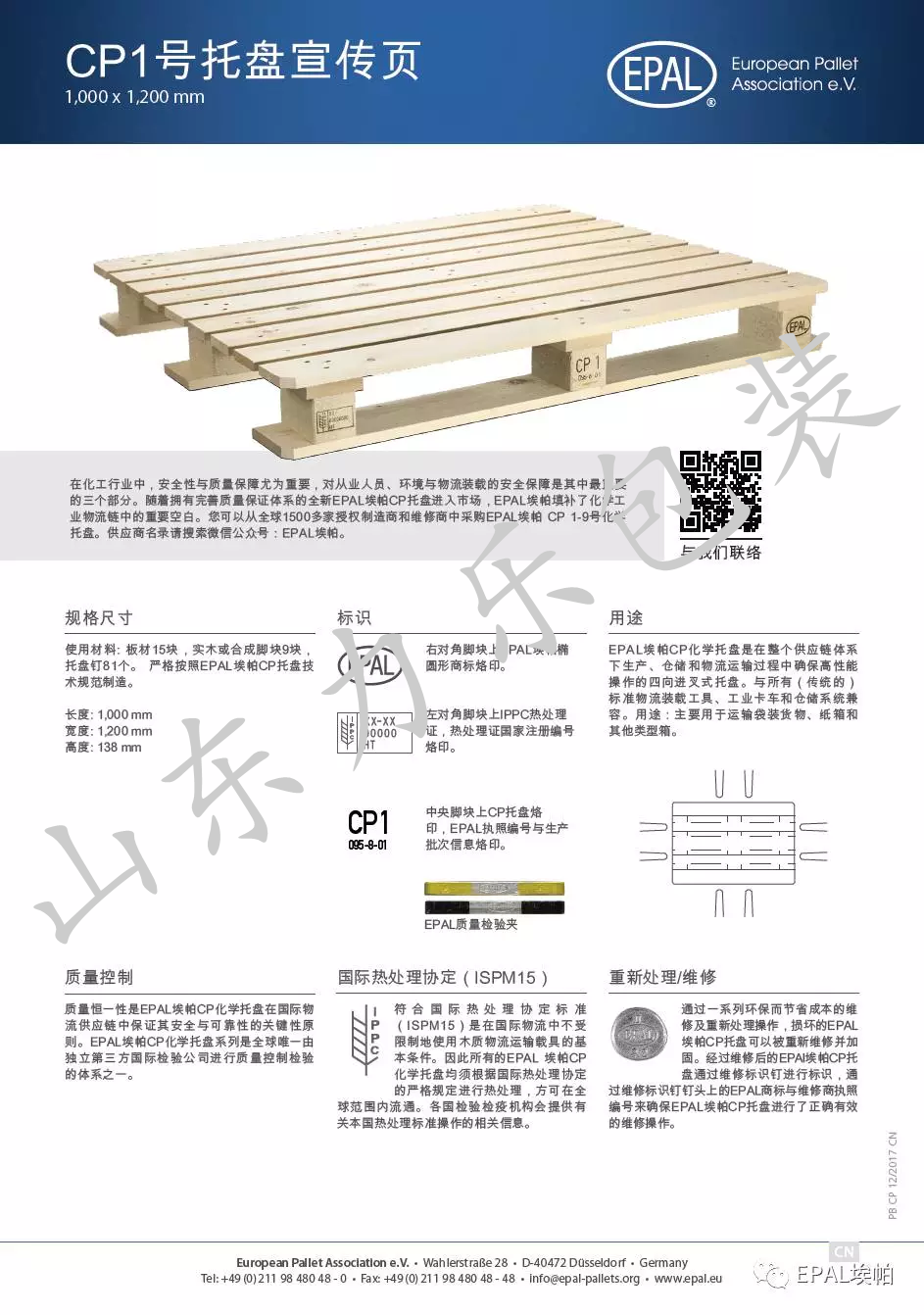 歐標(biāo)木托盤CP1化學(xué)托盤,現(xiàn)在國內(nèi)CP1型。 只是在尺寸上符合,質(zhì)量標(biāo)準(zhǔn)不能做到。2017年10月歐標(biāo)托盤協(xié)會正式接管cp系列托盤的運營監(jiān)管, 國外這個系列,對托盤使用的釘子,木板的厚度,結(jié)巴,釘子的距離都有嚴(yán)格的要求,并對托盤的制造企業(yè)采取許可證生產(chǎn)制度。 這個CP1 的標(biāo)志應(yīng)該在托盤的中間位置,使用烙印燙上去的。力樂包裝常年收購銷售二手cp1木托盤,定做全新歐標(biāo)cp1化學(xué)托盤,我公司有熱處理庫,可對歐標(biāo)cp1化學(xué)托盤進(jìn)行熱處理,熱處理后可直接出口,也可以出熱處理證明。